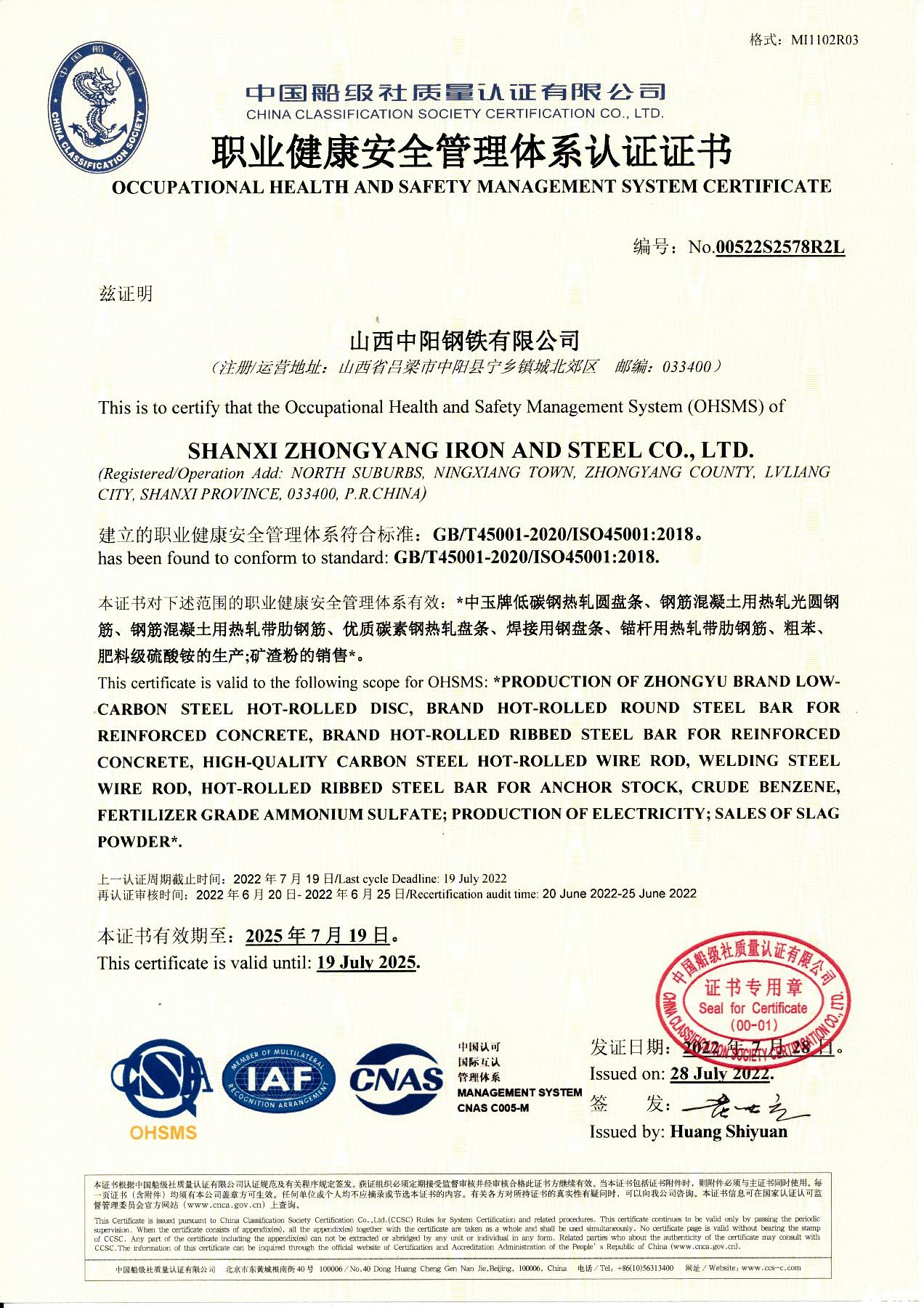 職業(yè)健康安全管理體系認證證書
